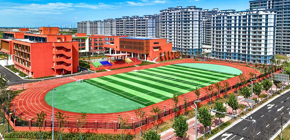 位于港城安置區(qū)一期B區(qū)南側(cè),占地面積46.5畝,建筑面積約2.2萬平方米,總投資約1.5億元。建設(shè)規(guī)模滿足36個(gè)班級(jí)1620人的辦學(xué)需求。項(xiàng)目總體布局采用院落式布局,包含教學(xué)樓、綜合樓、風(fēng)雨操場、門衛(wèi)、看臺(tái)五個(gè)單位工程。校園建筑整體為哈弗紅現(xiàn)代風(fēng)格、局部點(diǎn)綴彩色形體,增添活躍元素。
